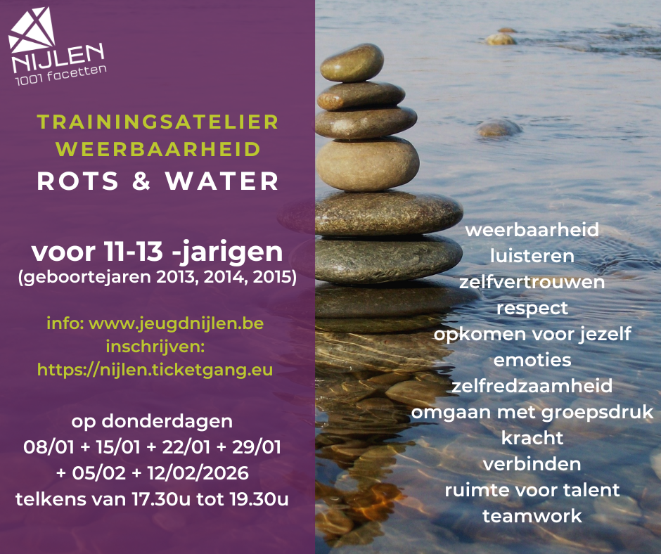 Rots en Water is een ’psycho-fysiek’ weerbaarheidsprogramma waarin jongeren leren om op een goede manier voor zichzelf op te komen. Lokaal bestuur Nijlen organiseert dit voorjaar een nieuwe reeks voor jongeren van 11 tot 13 jaar (leerlingen 5e + 6e leerjaar en 1ste middelbaar).